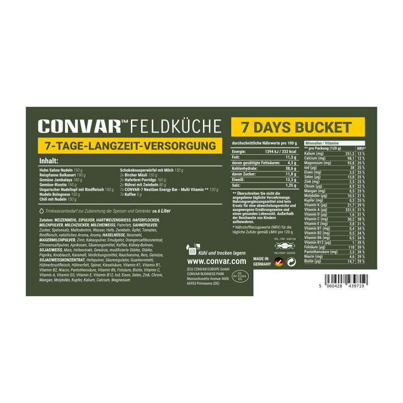 Het Convar 7 dagen noodrantsoen in emmer is dé oplossing voor wie direct een betrouwbare voedselvoorraad wil aanleggen en in één keer klaar wil zijn. Deze emmer biedt een complete en praktische basis. Bovendien is alles vooraf samengesteld, waardoor je geen losse producten hoeft te combineren en in één keer goed voorbereid bent.